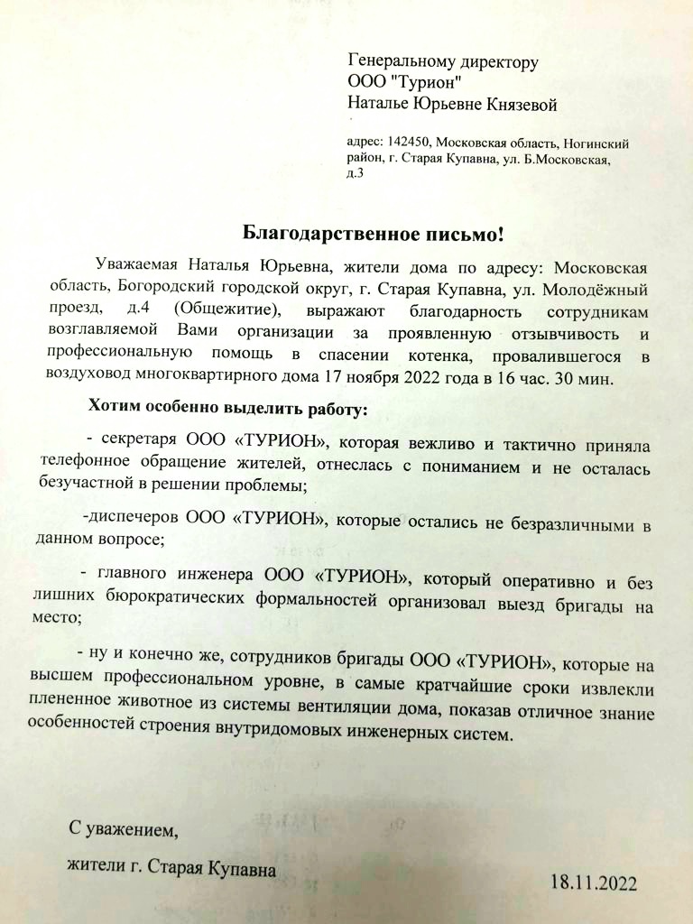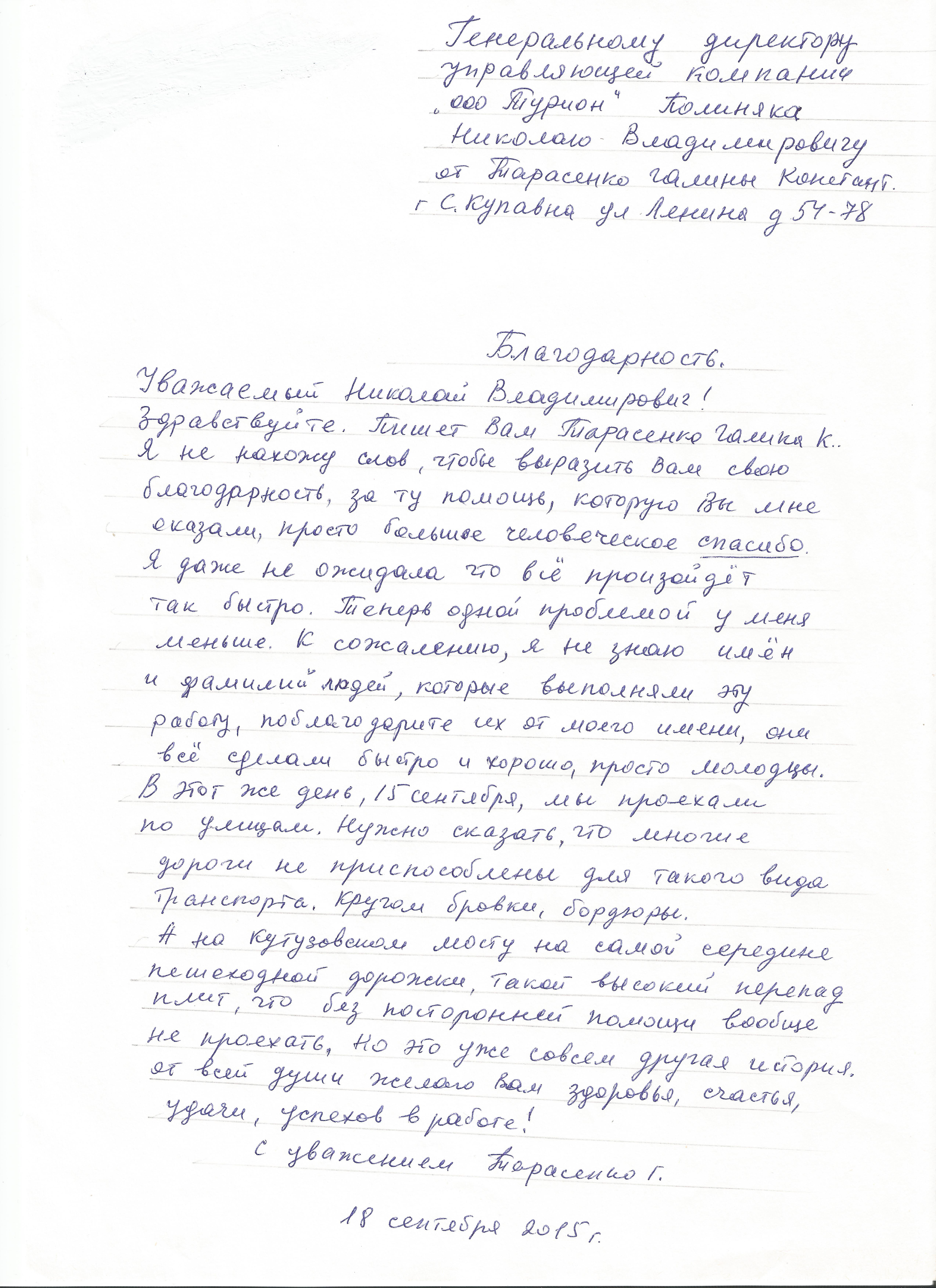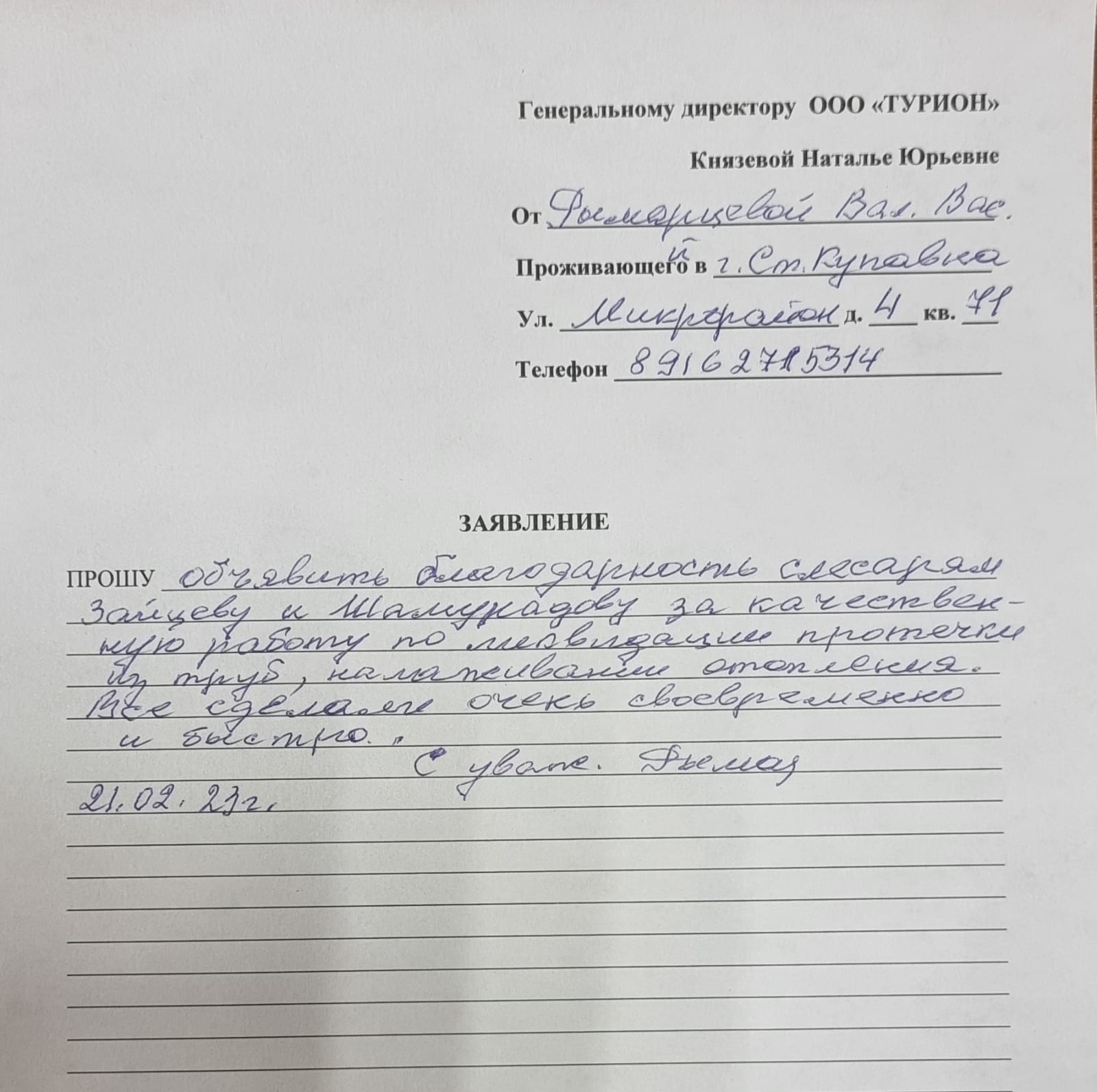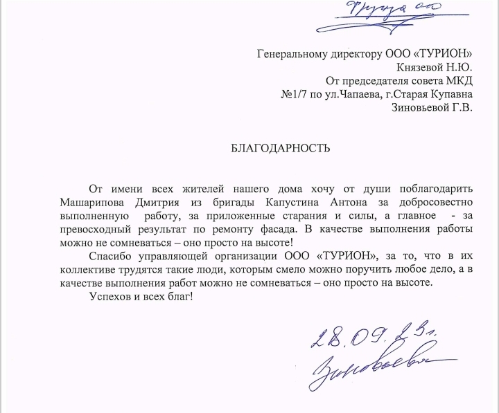 Добрый день! Выражаю искреннюю благодарность управляющей компании «Турион» и лично Полиняке Николаю Владимировичу за проявленное внимание и оперативный отклик на мою просьбу об устранении протечки кровли. Работа была выполнена в срок и качественно бригадой кровельщиков Игоря Бабкина и малярами Ольгой и Яной. Отрадно чувствовать особое внимание и неравнодушие, проявляемое вами к ветеранам и пенсионерам.