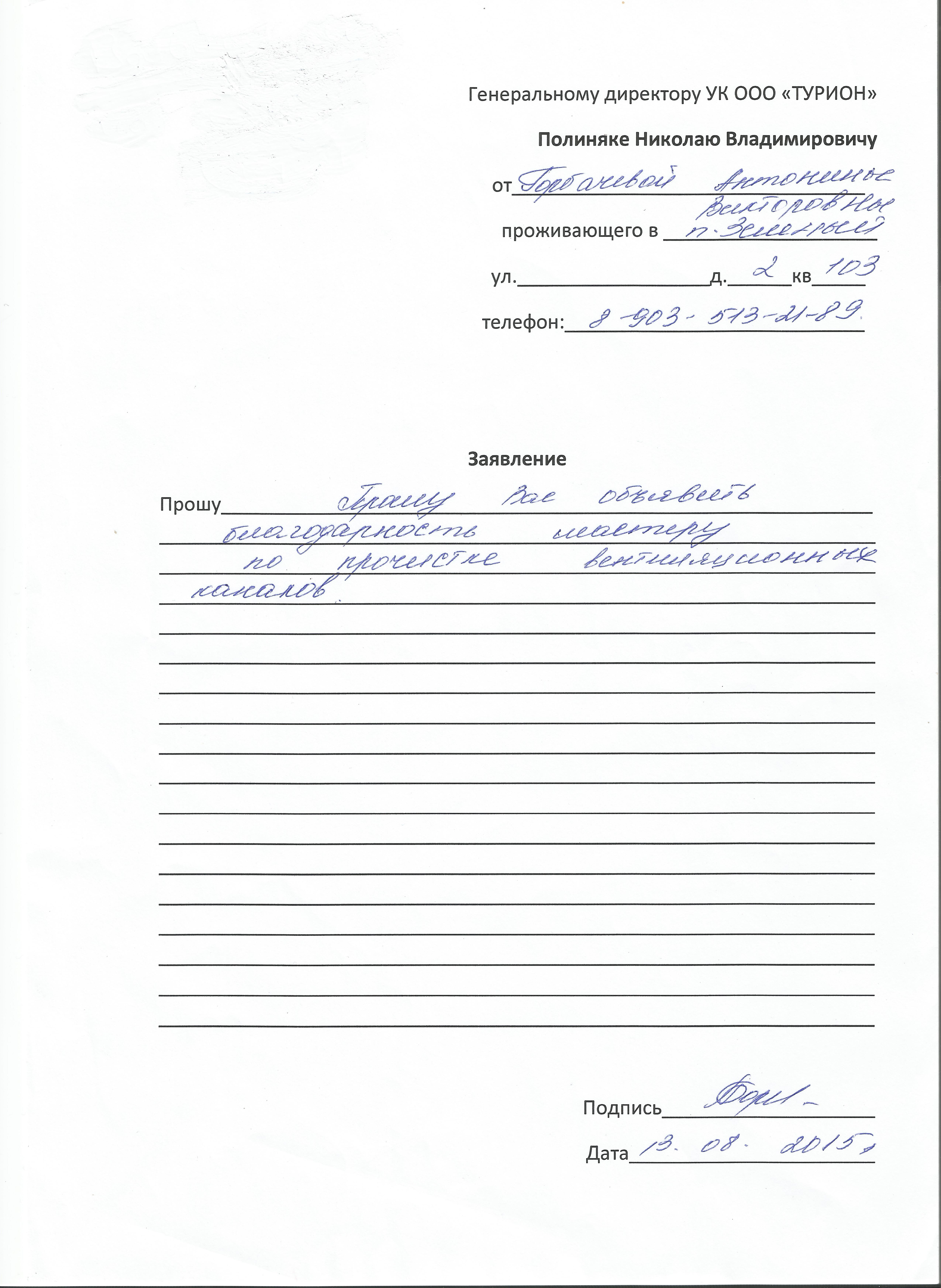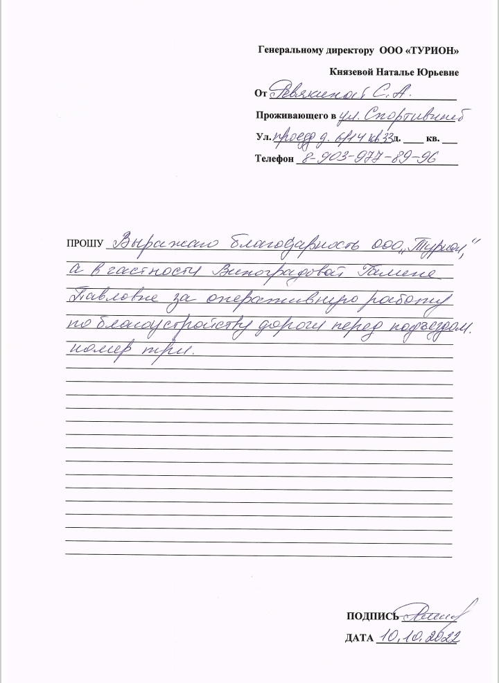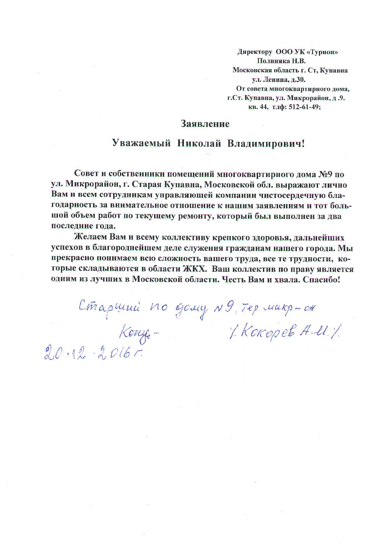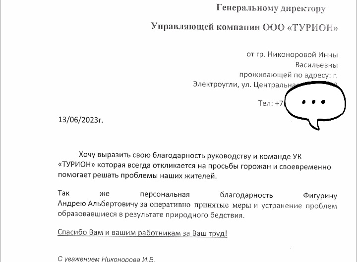 Добрый день! Выражаю искреннюю благодарность управляющей компании «Турион» и лично Полиняке Николаю Владимировичу за проявленное внимание и оперативный отклик на мою просьбу об устранении протечки кровли. Работа была выполнена в срок и качественно бригадой кровельщиков Игоря Бабкина и малярами Ольгой и Яной. Отрадно чувствовать особое внимание и неравнодушие, проявляемое вами к ветеранам и пенсионерам.