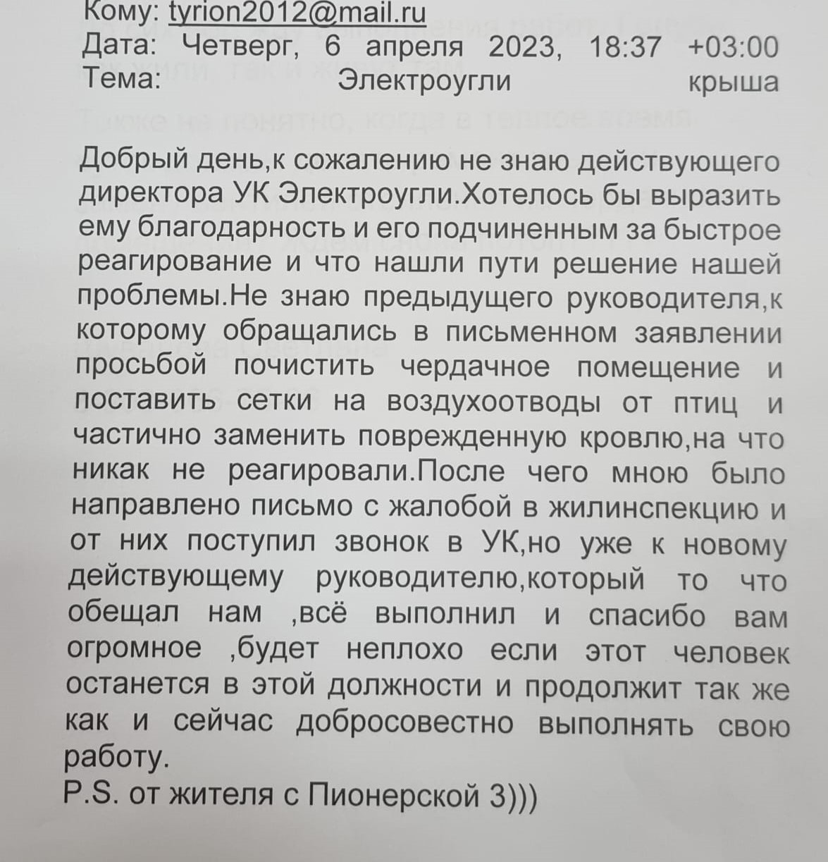 Хочу сказать спасибо за оперативное реагирование на обращение № 177311908 от 08.12.22 г. по поводу отопления подъезда в многоквартирном доме по адресу п. Рыбхоз д.16 (2 подъезд). Бригада пришла утром следующего дня. Теперь в подъезде тепло.