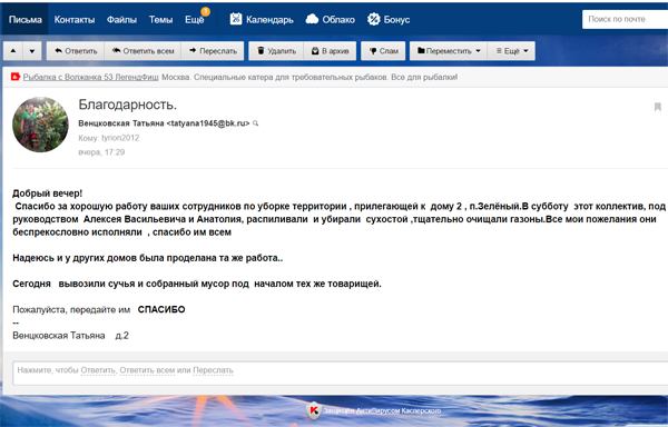 Уважаемая управляющая компания, пишут вам жильцы посёлка Колонтаево. Убедительная просьба выразить благодарность (в виде премии ) нашей ,, феи,, чистоты и порядка Дворнику Воробьёвой Светлане Вячеславовне. В посёлке всегда порядок, если это зима, то она уже в пять утра на работе, расчищает дорожки, чтобы люди смогли идти на работу не по сугробам! Летом все клумбы вокруг домов ухожены, посажены цветы, любо-дорого смотреть! В подъездах чисто! Да и вообще, чтобы в посёлке не случилось ( нет воды или перебои со светом ) наша ,, генеральша,, всегда в курсе происходящего, и можно получить ответ!